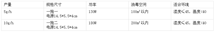 | 5g/h | 一拖一 電源14.5*5.5*4cm | 130W | 100m3以內(nèi) | 濕度≤45,溫度<40 |